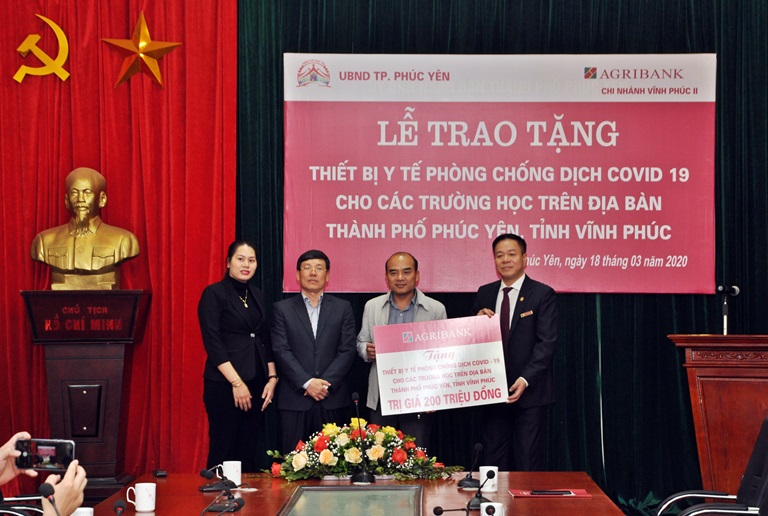 Ngày 18/3, góp phần cùng cộng đồng phòng, chống dịch COVID-19, Ngân hàng Nông nghiệp và Phát triển nông thôn Việt Nam - Chi nhánh Vĩnh Phúc II (Agribank Chi nhánh Vĩnh Phúc II), tổ chức trao 130 máy đo thân nhiệt có tổng trị giá 200 triệu đồng, do tập thể cán bộ, nhân viên quyên góp tặng các trường học trên địa bàn thành phố Phúc Yên, tỉnh Vĩnh Phúc.
