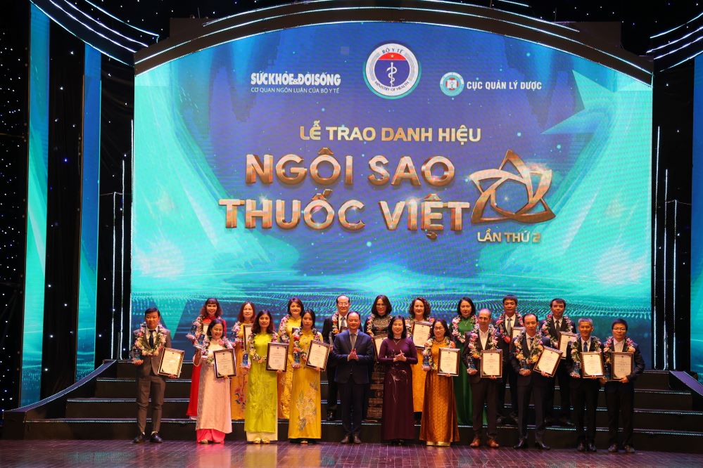 Bộ trưởng Bộ Y tế Đào Hồng Lan và Thứ trưởng Bộ Khoa học và Công nghệ Trần Hồng Thái trao danh hiệu “Ngôi sao Thuốc Việt” lần 2 cho 18 đơn vị, doanh nghiệp. Ảnh: VOV |