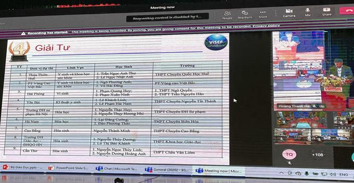 Năm nay, do ảnh hưởng của dịch COVID-19, lần đầu tiên cuộc thi Khoa học Kỹ thuật cấp quốc gia dành cho học sinh Trung học được tổ chức theo hình thức trực tuyến trên toàn quốc. Kết thúc cuộc thi, Bộ Giáo dục và Đào tạo đã trao 12 giải Nhất, 15 giải Nhì, 17 giải Ba, 27 giải Tư và 23 giải Triển vọng ở tất cả các lĩnh vực.