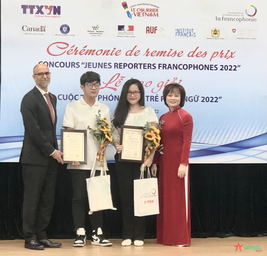 Đại sứ Canada Shawn Perry Steil và bà Nguyễn Hồng Nga, Tổng biên tập Báo Le Courrier du Vietnam trao giải cho các thí sinh đoạt giải nhì. |