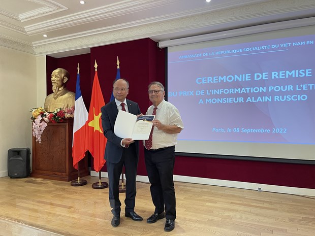 Ngày 8/9 tại trụ sở Đại sứ quán Việt Nam ở thủ đô Paris, thay mặt Ban tổ chức Giải thưởng Thông tin đối ngoại 2021, Đại sứ Đinh Toàn Thắng đã trao giải Khuyến khích cho nhà sử học Alain Ruscio, chuyên gia về Lịch sử cận đại Việt Nam, với bài viết "Việt Nam năm 1945 mở đường phi thực dân hóa", xuất bản ngày 4/9/2020 trên nhật báo L'Humanité (Nhân đạo) phiên bản điện tử.