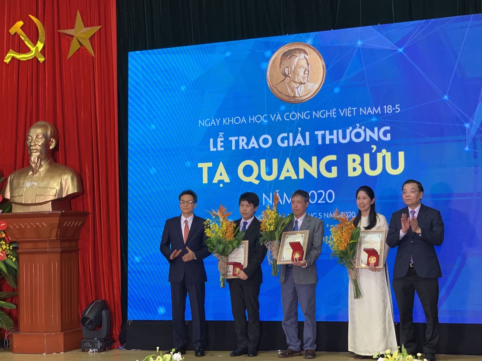 Phó Thủ tướng Chính phủ Vũ Đức Đam và Bộ trưởng Bộ Khoa học và Công nghệ Chu Ngọc Anh trao giải thưởng và bằng chứng nhận cho các tác giả nhận Giải thưởng Tạ Quang Bửu năm 2020. - Ảnh: baotintuc |