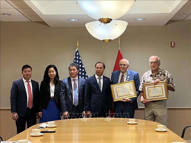 Đại diện Đại sứ quán Việt Nam tại Mỹ và Liên hiệp các tổ chức hữu nghị Việt Nam cùng những người bạn Mỹ tại buổi lễ trao Kỷ niệm chương - Ảnh: Hồng Nguyên/TTXVN |