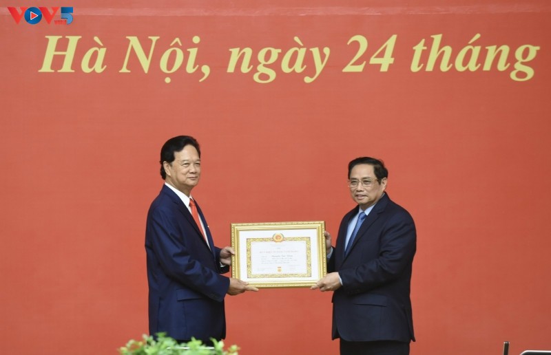 Thay mặt lãnh đạo Đảng, Nhà nước, Thủ tướng Phạm Minh Chính trao tặng Huy hiệu 55 năm tuổi Đảng cho nguyên Thủ tướng Nguyễn Tấn Dũng. Ảnh: Vũ Khuyên/ VOV |