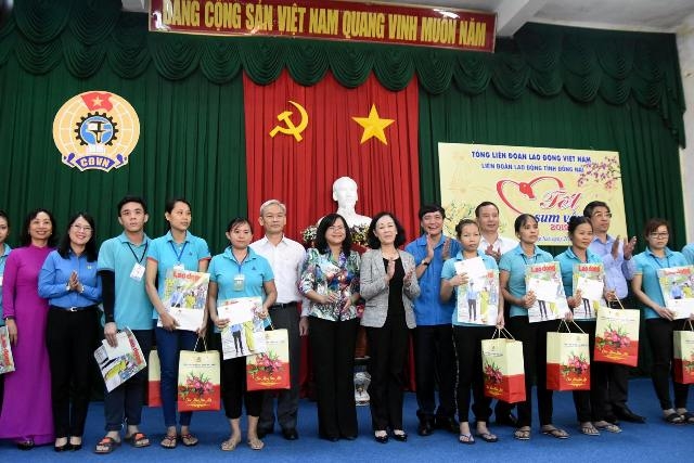 Bà Trương Thị Mai tặng 50 phần quà cho công nhân nghèo, hoàn cảnh khó khăn tại tỉnh Đồng Nai. Trò chuyện với công nhân, bà Trương Thị Mai đánh giá cao những sáng kiến, chương trình mà Liên đoàn Lao động các cấp tổ chức chăm lo Tết cho công nhân lao động như chương trình “Tết sum vầy”, tặng vé tàu, xe cho công nhân về quê ăn Tết...