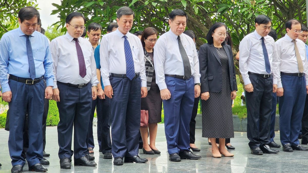 Đoàn công tác của Trưởng Ban Tuyên giáo Trung ương cùng lãnh đạo tỉnh Điện Biên dâng hương tưởng niệm các anh hùng, liệt sỹ. Ảnh: VOV |
