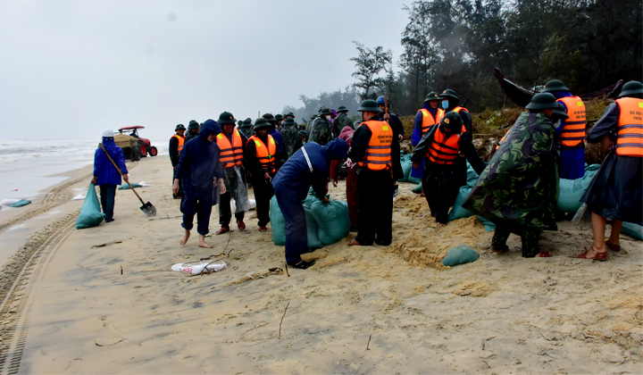 | Các lực lượng vũ trang tỉnh dung bao cát gia cố các điểm xung yếu sạt lở bờ biển trước khi bão số 13 đổ bộ.Ảnh: Cổng TTĐT TT-Huế |