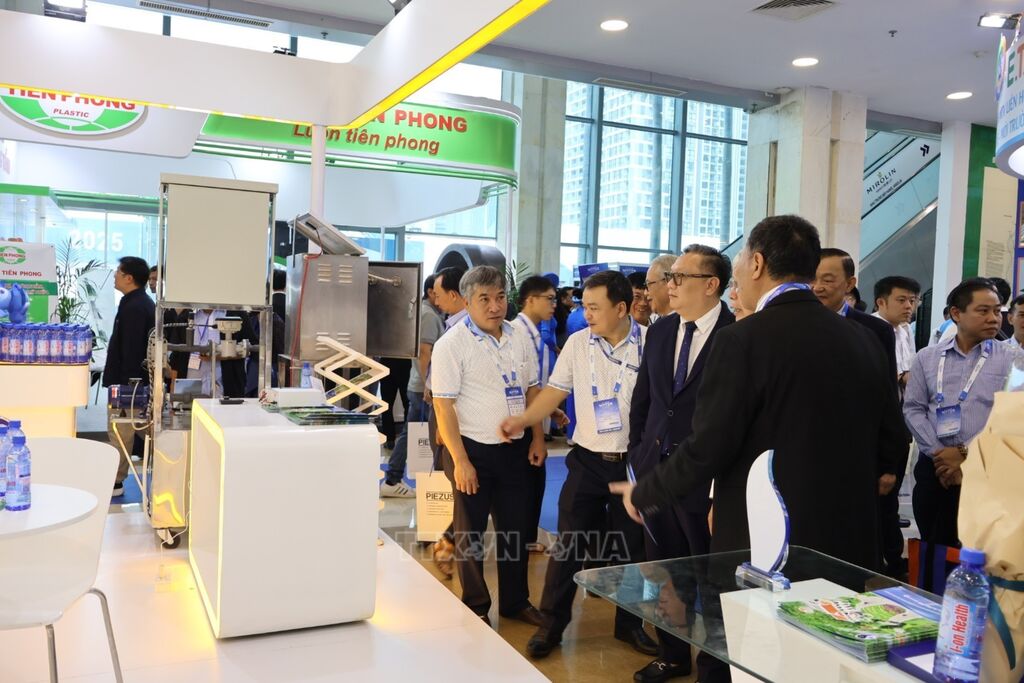 Các đại biểu tham quan các gian hàng tại Triển lãm quốc tế ngành Cấp thoát nước và Vệ sinh môi trường. Ảnh: TTXVN |