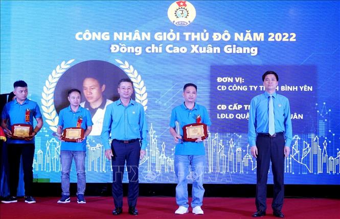 Công nhân lao động đón nhận Bằng công nhận "Công nhân giỏi Thủ đô" năm 2022 do Lãnh đạo Tổng Liên đoàn Lao động Việt Nam và Liên đoàn Lao động Hà Nội trao tặng. Ảnh: TTXVN |