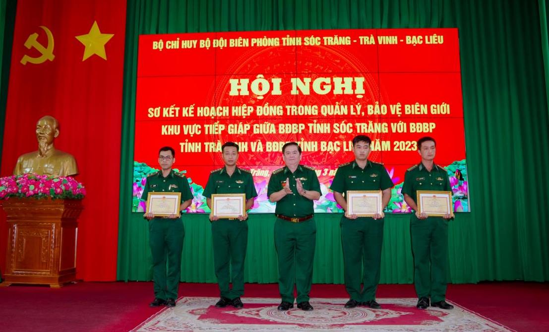 Đại tá Trịnh Kim Khâm, Chỉ huy trưởng BĐBP Sóc Trăng trao tặng giấy khen cho các tập thể và cá nhân vì có thành tích tiêu biểu trong công tác phối hợp, hiệp đồng quản lý, bảo vệ biên giới khu vực tiếp giáp năm 2023. Ảnh: Văn Long/Báo Biên Phòng