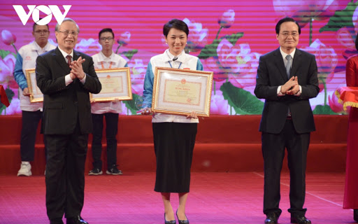 Ủy viên Bộ Chính trị, Thường trực Ban Bí thư Trung ương Đảng - Trần Quốc Vượng cùng Bộ trưởng Bộ GDĐT - Phùng Xuân Nhạ trao bằng khen cho cá nhân có thành tích xuất sắc. Ảnh: VOV |