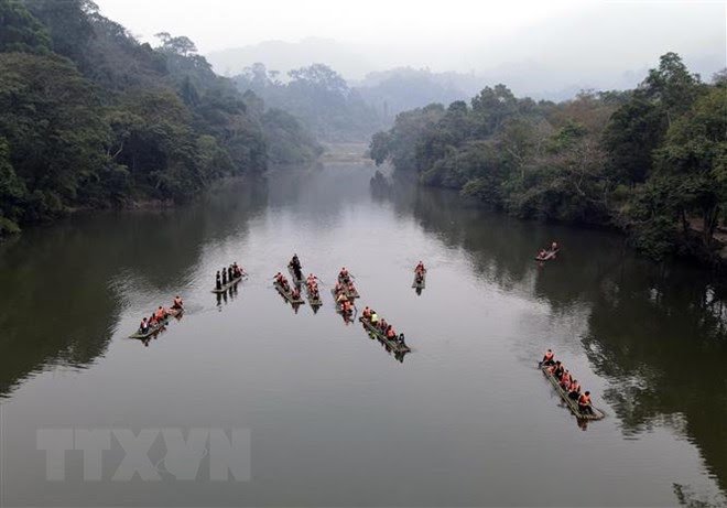 Bơi mảng-hát then trên hồ Nà Nưa. Ảnh Vũ Quang/TTXVN |