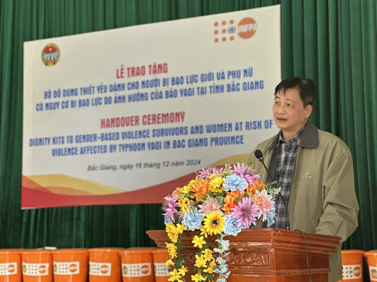 Phát biểu tại lễ trao tặng, ông Matt Jackson - Trưởng đại diện Quỹ Dân số Liên Hợp Quốc tại Việt Nam khẳng định, sự hỗ trợ này như một sự cam kết của UNFPA luôn đồng hành cùng với phụ nữ, trẻ em gái và những người dễ bị tổn thương để không ai bị bỏ lại phía sau trong bất kỳ hoàn cảnh nào: “Chúng tôi cho rằng hậu quả của cơn bão hay thảm họa thiên tai không chỉ bị ảnh hưởng ngay lập tức, mà còn tác động dài hạn. Nhu cầu của người dân là lâu dài, đặc biệt trong giai đoạn phục hồi. Và, hôm nay chúng tôi ở đây, cung cấp các bộ đồ dùng thiết yếu cho phụ nữ Bắc Giang, giống như những gì chúng tôi đã làm ở các tình thành khác ở Việt nam. Tất cả trong đó là những vật dụng cá nhân thiết yếu có thể dùng trong bất kỳ hoàn cảnh nào như bàn chải kem đánh răng, quần áo lót, đèn pin, bột giặt..."