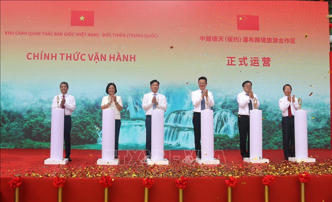 Ấn nút vận hành chính thức Khu cánh quan thác Bản Giốc (Việt Nam) - Đức Thiên (Trung Quốc). Ảnh: TTXVN |