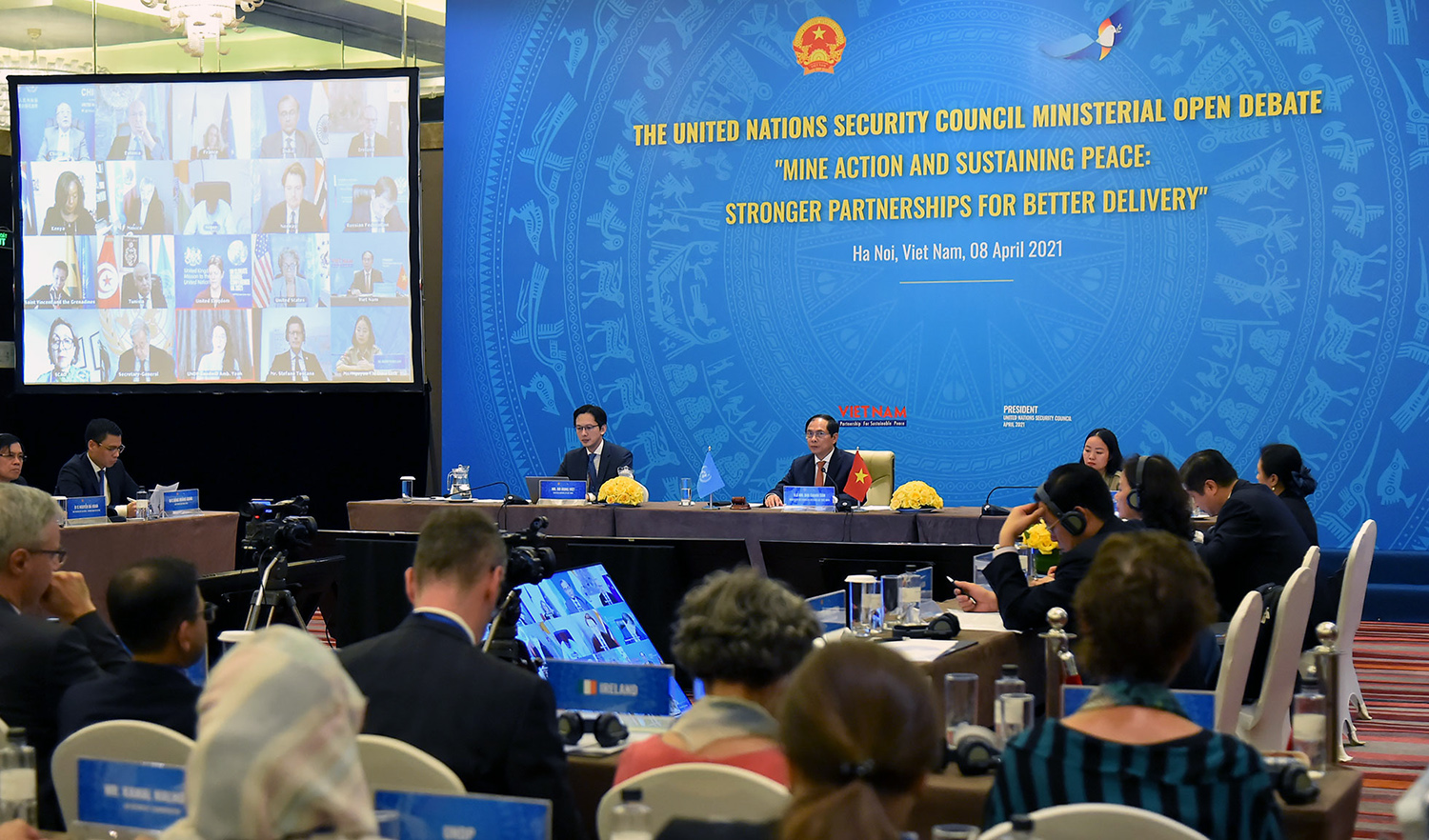 Ngày 08/04, dưới sự chủ trì của Bộ trưởng Ngoại giao Bùi Thanh Sơn trên cương vị Chủ tịch Hội đồng Bảo an Liên hợp quốc tháng 4/2021, Việt Nam đã tổ chức Phiên Thảo luận mở cấp Bộ trưởng của Hội đồng bảo an về chủ đề “Khắc phục hậu quả bom mìn và duy trì hòa bình bền vững: Tăng cường gắn kết để hành động hiệu quả hơn” dưới hình thức kết hợp giữa trực tuyến và trực tiếp tại Hà Nội.