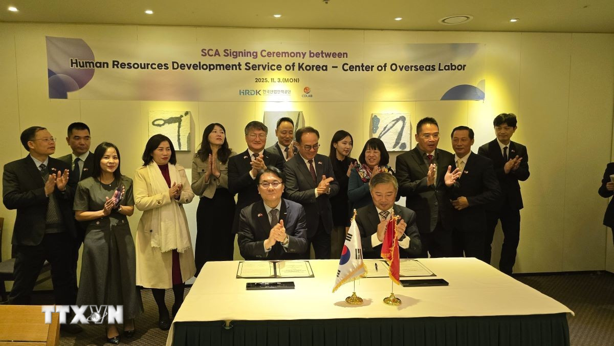 Thứ trưởng Bộ Nội vụ Vũ Chiến Thắng chứng kiến lễ ký Thỏa thuận cam kết cung cấp dịch vụ (SCA) giữa HRD Korea và Trung tâm Lao động ngoài nước (COLAB). Ảnh: Đức Thắng/TTXVN |