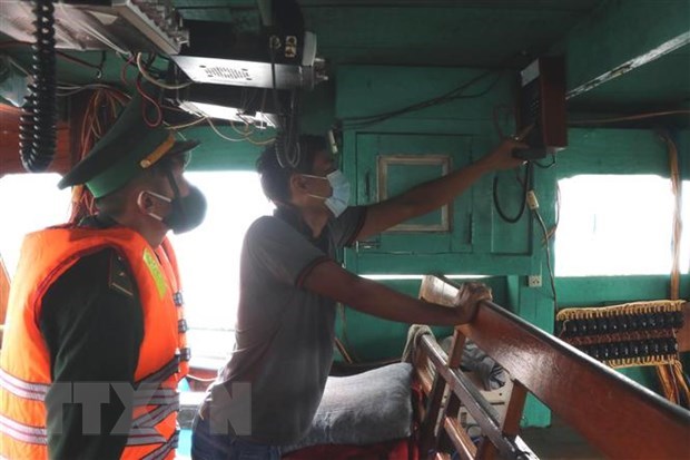 Kiểm tra thiết bị liên lạc trên tàu đánh bắt xa bờ của ngư dân. Ảnh: Đỗ Trưởng/TTXVN |