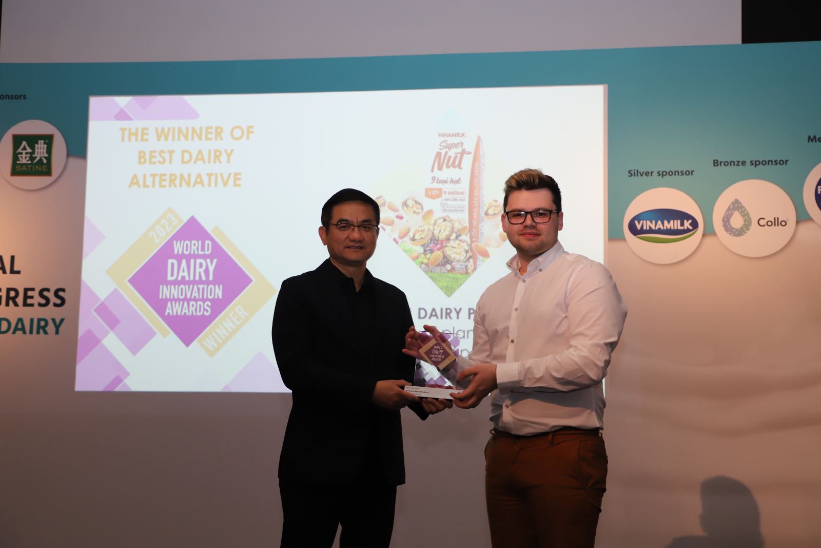 Tại hội nghị Sữa Toàn cầu lần thứ 16, được tổ chức tại Thủ đô London (Vương quốc Anh), sản phẩm sữa hạt Super Nut của Công ty cổ phần sữa Việt Nam (Vinamilk) đã đoạt giải Best Dairy Alternative 2023 (Đại diện Ban Tổ chức trao giải Sản phẩm thay thế sữa tốt nhất cho Super Nut của Vinamilk. Ảnh: Hải Vân/TTXVN tốt nhất). Đây là một trong những hạng mục giải có tính cạnh tranh cao nhất, với 10 đề cử.