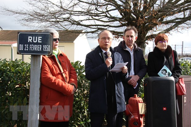 Đại sứ Việt Nam tại Pháp Đinh Toàn Thắng phát biểu tại buổi lễ tưởng niệm và vinh danh ngày nữ chiến sỹ cộng sản Pháp Raymonde Dien, ngày 25/2 tại thành phố Saint-Pierre-des-Corps. Nguồn: TTXVN |