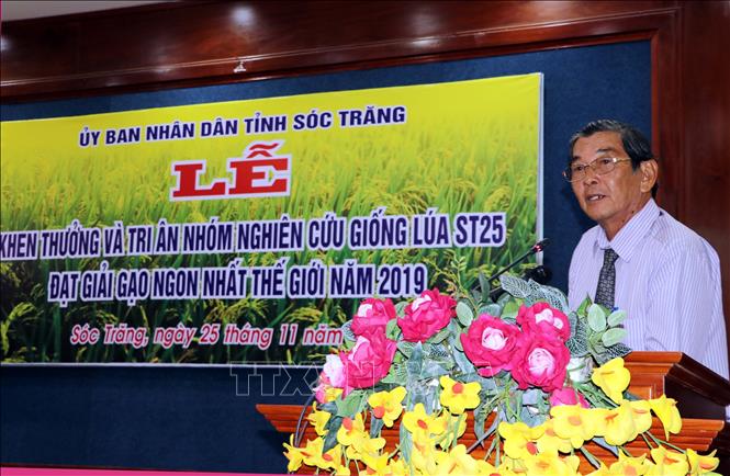 Ngày 25/11, Ủy ban nhân dân tỉnh Sóc Trăng đã tổ chức Lễ khen thưởng và tri ân nhóm nghiên cứu giống lúa ST25, giống lúa vừa đoạt giải cao nhất trong cuộc thi Gạo ngon nhất thế giới năm 2019 (World’s Best Rice) tại Hội nghị quốc tế lần thứ 11 về thương mại gạo, tổ chức tại Manila, Philippines. Nhóm nhà khoa học gồm Anh hùng Lao động, kỹ sư Hồ Quang Cua, Tiến sĩ Trần Tấn Phương và Thạc sĩ Nguyễn Thị Thu Hương là những người đã lai tạo thành công giống lúa này.