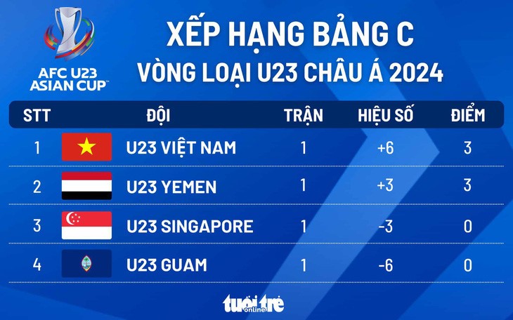 Bảng xếp hạng bảng C vòng loại Giải U23 châu Á 2024: U23 Việt Nam tạm dẫn đầu. Đồ họa: An Bình/Báo Tuổi trẻ |