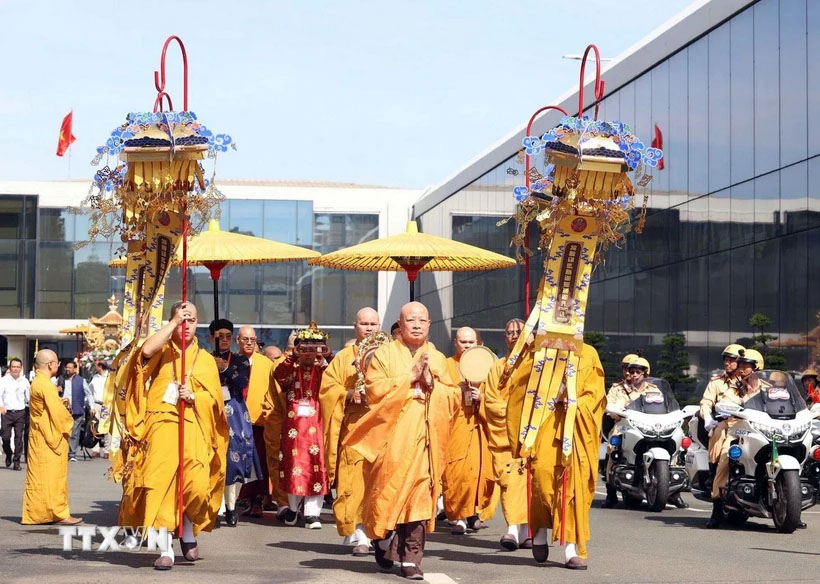 Xá lợi Đức Phật Thích Ca được cung rước từ sân bay Tân Sơn Nhất về Học viện Phật giáo Việt Nam tại Thành phố Hồ Chí Minh. Ảnh: TTXVN phát |