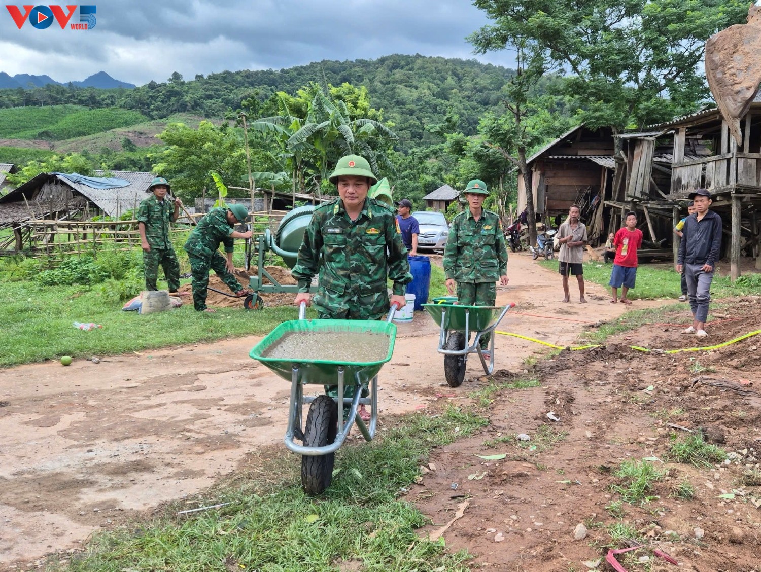 Bộ đội Biên phòng huy động ngày công giúp người dân nơi biên giới xây nhà mới. Ảnh: VOV |