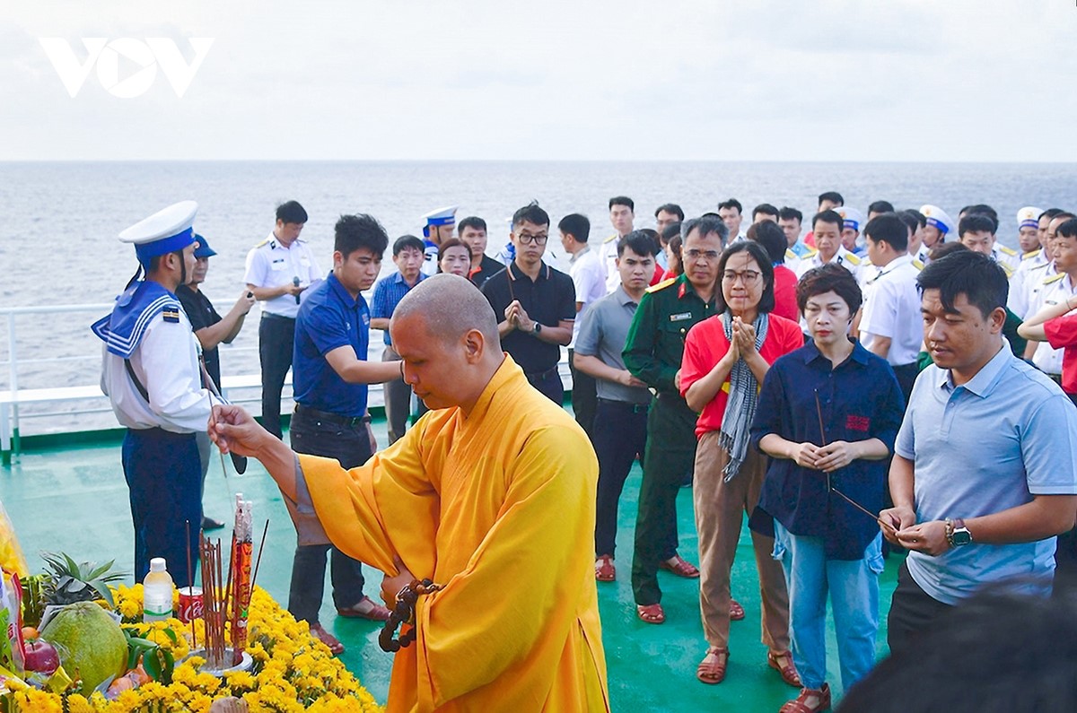 Sau lễ dâng hương, đoàn công tác thực hiện nghi lễ thả vòng hoa, lễ vật, cùng những cánh hạc giấy và hoa đăng để tưởng nhớ tới anh linh các anh hùng liệt sĩ. Trung tá Bùi Văn Quê, Phó Chủ nhiệm Chính trị Vùng 4 Hải quân, khẳng định: "Chúng tôi, những thế hệ cán bộ, chiến sĩ đang tiếp nối truyền thống bảo vệ chủ quyền biển đảo của Tổ quốc. Chúng tôi xin hứa với Đảng, Nhà nước, Quân uỷ Trung ương, Bộ Quốc phòng và các thế hệ cha anh đi trước cũng như đồng bào cả nước trong mọi hoàn cảnh cán bộ, chiến sĩ Trường Sa chúng tôi trung thành tuyệt đối với Đảng, Nhà nước và nhân dân, quyết tâm bảo vệ vững chắc chủ quyền biển đảo của Tổ quốc trong mọi tình huống".