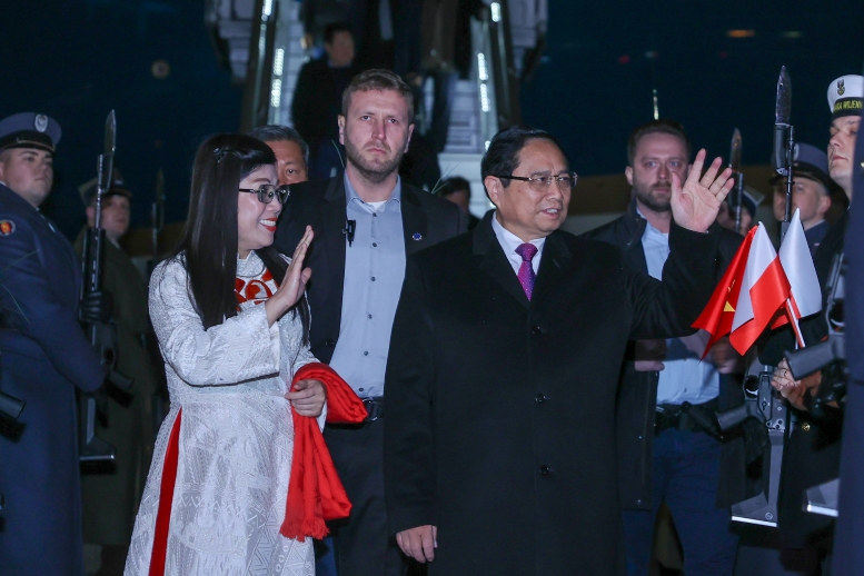 Prime Minister Pham Minh Chinh, his wife, and a high-ranking Vietnamese delegation, arrived in Warsaw, starting an official visit to the Republic of Poland. (Photo: VGP/Nhat Bac)