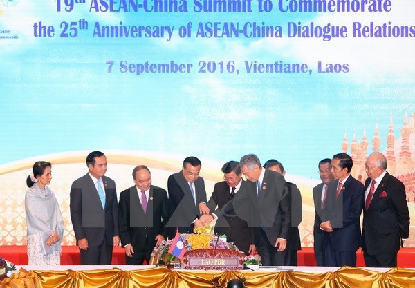 | The ASEAN and Chinese leaders perform a ceremonial action at the commemoration of the 25th anniversary of ASEAN-China Dialogue Relations (Photo: VNA) |