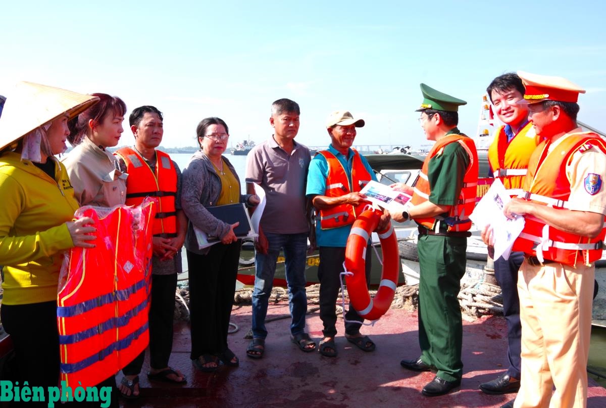 Soldiers of the Ho Chi Minh Border Guard and other forces distribute leaflets to the fishermen to raise their awareness on legal issues. (Photo: Le Khoa/bienphong.com.vn) |