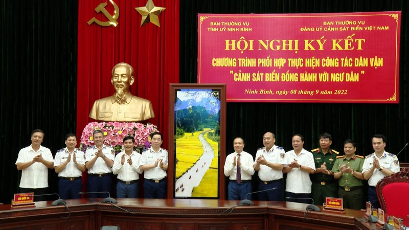 The conference to sign the "Coast Guards accompany fishermen" program between the Standing Board of the Party Committee of the Vietnam Coast Guard and the Ninh Binh Provincial Party Committee (Photo: Nhan Dan Newspapers) |