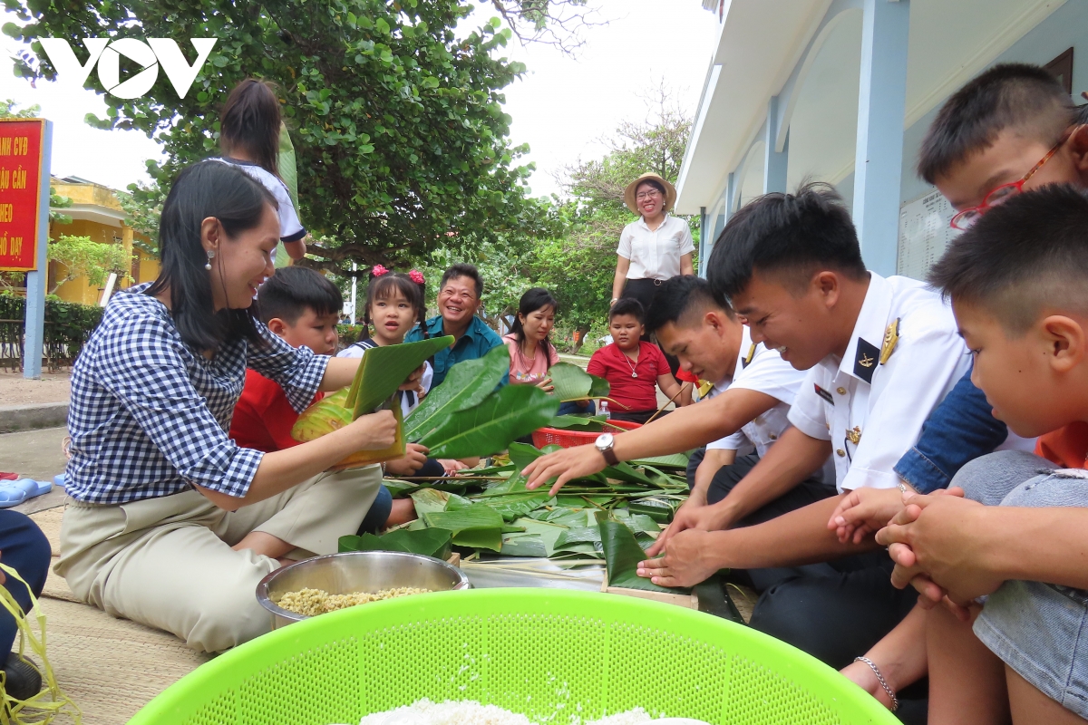 Chung cake wrapping is full of fun. We feel cozy and abundant. The soldiers teach the children how to wrap Chung cake, helping them better understand Tet traditions, said Nguyen Thi Lan a resident on Song Tu Tay island.