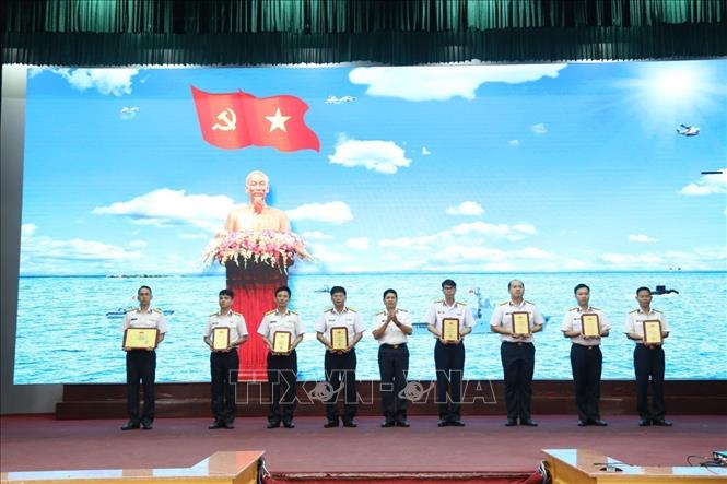 Rear Admiral Ngo Van Thuan presents certificates of merits to honor outstanding naval soldiers (Photo: VNA) |