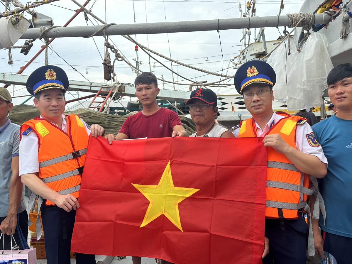 General Bui Quoc Oai (L) hands over a national flag to Tho Chu fishermen. |