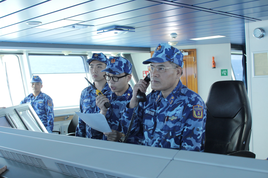 Colonel Luong Cao Khai, Deputy Commander and Chief of Staff of Coast Guard Region 1, calls the Commander of the China Coast Guard on the joint patrol. (Photo: Đo Hung/baoquangninh.vn) |