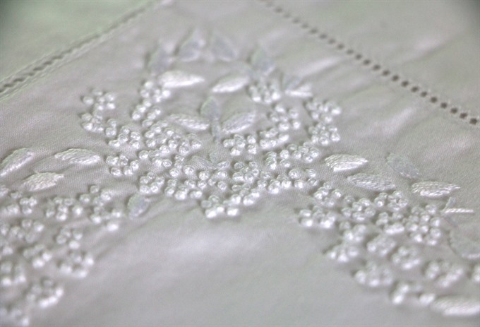 Van Lam native Dinh Thi Mai has a showroom displaying her embroidery and lace products in Hanoi’s Hang Gai Street: “Vietnamese people learned the lace craft from French people but our techniques and designs have improved, making them uniquely attractive. Many Western customers have praised our products as even more beautiful than the samples. That makes us very proud.”