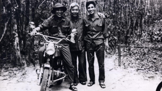 | Late VNA General Director Daoo Tung (center), journalist Tran Mai Hanh (right), and Van Bao in Tay Ninh forest on 29/4/1975. |