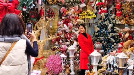 (VOVWORLD) - 再过两个星期才到圣诞节,但现在,河内多条街道已经装扮的漂漂亮亮,摆放很多闪闪发光的松树、雪人、桂冠等装饰品。