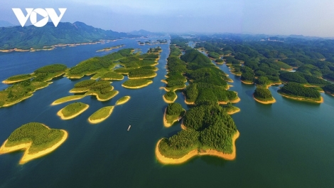(VOVWORLD) - 越南四大人工湖之一,安沛省婆瀑湖(hồ Thác Bà)水面面积大、小岛众多,就像一幅美丽的水彩画。婆瀑湖以其绿意盎然、诗意十足的景色被誉为“山上的下龙湾(世界自然遗产)”。