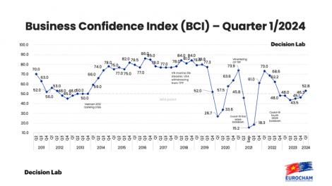 (VOVWORLD) - 越南欧洲商会(EuroCham)4月8日公布了对1400多名欧洲商会会员的调查结果。结果显示,在越欧洲企业的商业信心指数(BCI)2024年第一季度达到52.8,为2022年以来的最高水平。