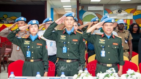 (VOVWORLD) - 10月4日,联合国南苏丹维和特派团在朱巴市基地举行仪式,向参加联合国南苏丹维和行动的越南公安部工作组3名指挥官授予联合国维和勋章,以表彰他们在联合国维和行动中取得的杰出成就。