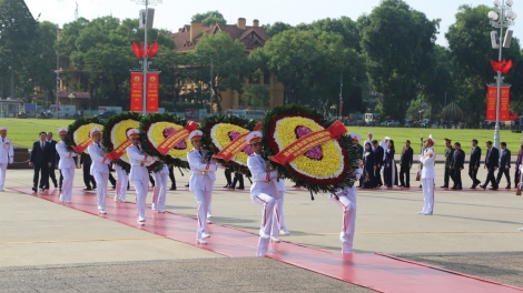 (VOVWORLD) - 值此越南荣军烈士节76周年之际,越共中央委员会、国会、国家主席、政府、祖国阵线中央委员会代表团7月27日上午在河内北山路英雄烈士纪念碑敬献花圈,缅怀英雄烈士并入陵瞻仰胡志明主席遗容。