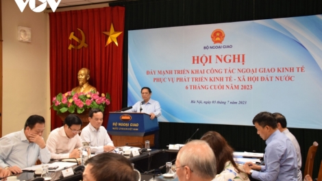 (VOVWORLD) -越南政府总理范明政7月3日下午在河内主持召开2023年最后6个月,加强经济外交服务社会经济发展会议。会议与全球94个分会场连线。