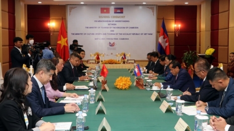 (VOVWORLD) - 越南文化体育旅游部部长阮文雄和柬埔寨旅游部部长兼奥委会主席唐坤(Thong Khon)5月6日在柬埔寨首都金边举行会谈。