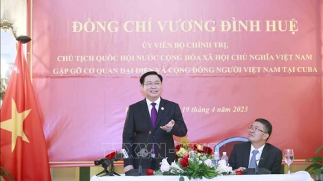 (VOVWORLD) -当地时间4月19日,正对古巴进行正式访问的越南国会主席王庭惠一行与越南驻古大使馆干部、工作人员及旅居古巴越南人代表见面。
