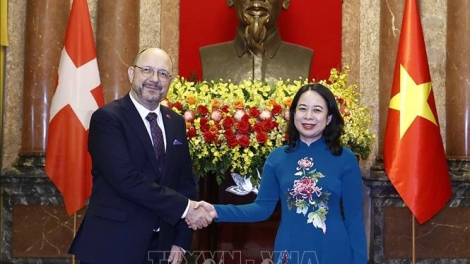 (VOVWORLD) - 越南国家代主席武氏映春2月22日上午在主席府会见前来递交国书的瑞士驻越南大使托马斯·加斯(Thomas Gass)、马来西亚驻越南大使陈扬泰(Tan Yang Thai)和柬埔寨驻越南大使谢金塔(Chea Kimtha)。