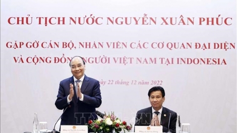 (VOVWORLD) - 12月22日晚,越南国家主席阮春福看望慰问越南驻印度尼西亚大使馆、越南驻东盟代表团干部、工作人员和正在印度尼西亚生活、工作的越南人代表。