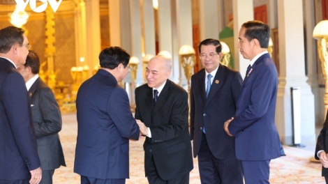 (VOVWORLD) - 值访问柬埔寨并出席第40和41届东盟峰会之际,越南政府总理范明政同东盟其他国家领导人11月10日在金边礼节性拜会了柬埔寨国王诺罗敦·西哈莫尼(Norodom Sihamoni)。