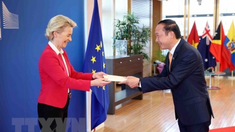(VOVWORLD) - 越南驻欧盟(EU)代表团团长阮文草大使7月14日向欧盟委员会主席冯德莱恩(Ursula Von der Leyen)递交委任书。